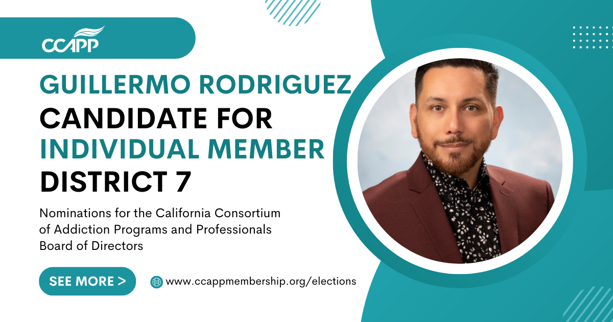 Candidate Statement My name is Dr. Guillermo Rodriguez, and I would like the opportunity to serve another term as an Individual Board Member for District 7 because I believe in change and understand that it starts from within. As the current Policies & Procedures and Membership Committee Chair, I have seen the positive impact CCAPP has had in promoting opportunities to grow the profession. At one point in my life, I struggled with addiction, which led to my time in prison. Then, I found recovery, went back to school, earned my CADC II, and eventually earned my Doctor of Social Work at the University of Southern California. Today, as a professor at California State University, Monterey Bay, I always encourage students to pursue their dreams, reach their goals, and motivate them to become the next generation of SUD counselors. When I discovered CCAPP, I found a place where I was welcomed and felt safe. This is the light I bring to others in our community as a professional. I also work in the emergency department and witness the damage caused by substance use and mental health issues in our community. As a clinical social worker and a substance use navigator, I stay informed on the latest research about treatment approaches, especially for our youth. I hope to earn your vote and continued support as I seek another term for District 7. My mission is to continue educating, speaking from the heart, and standing for those finding their way to recovery. Mahatma Gandhi once said, “Be the change you want to see in the world.” I strive to embody that change through resilience, passion, and service. I look forward to continuing to represent District 7. jGracias! |
